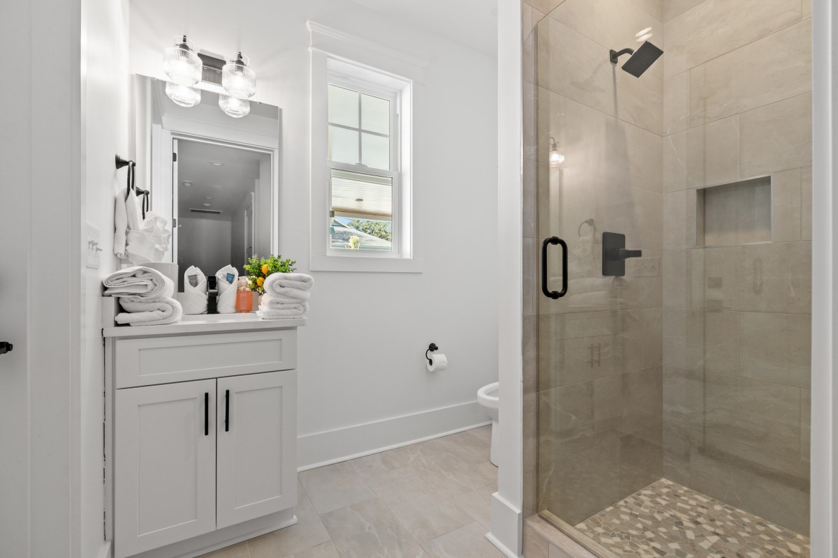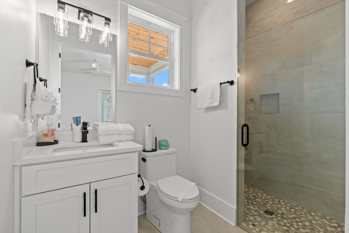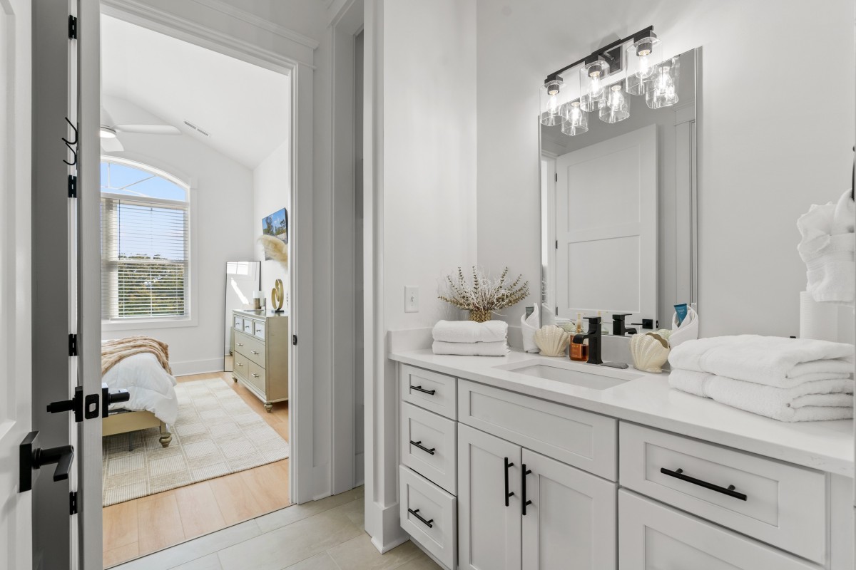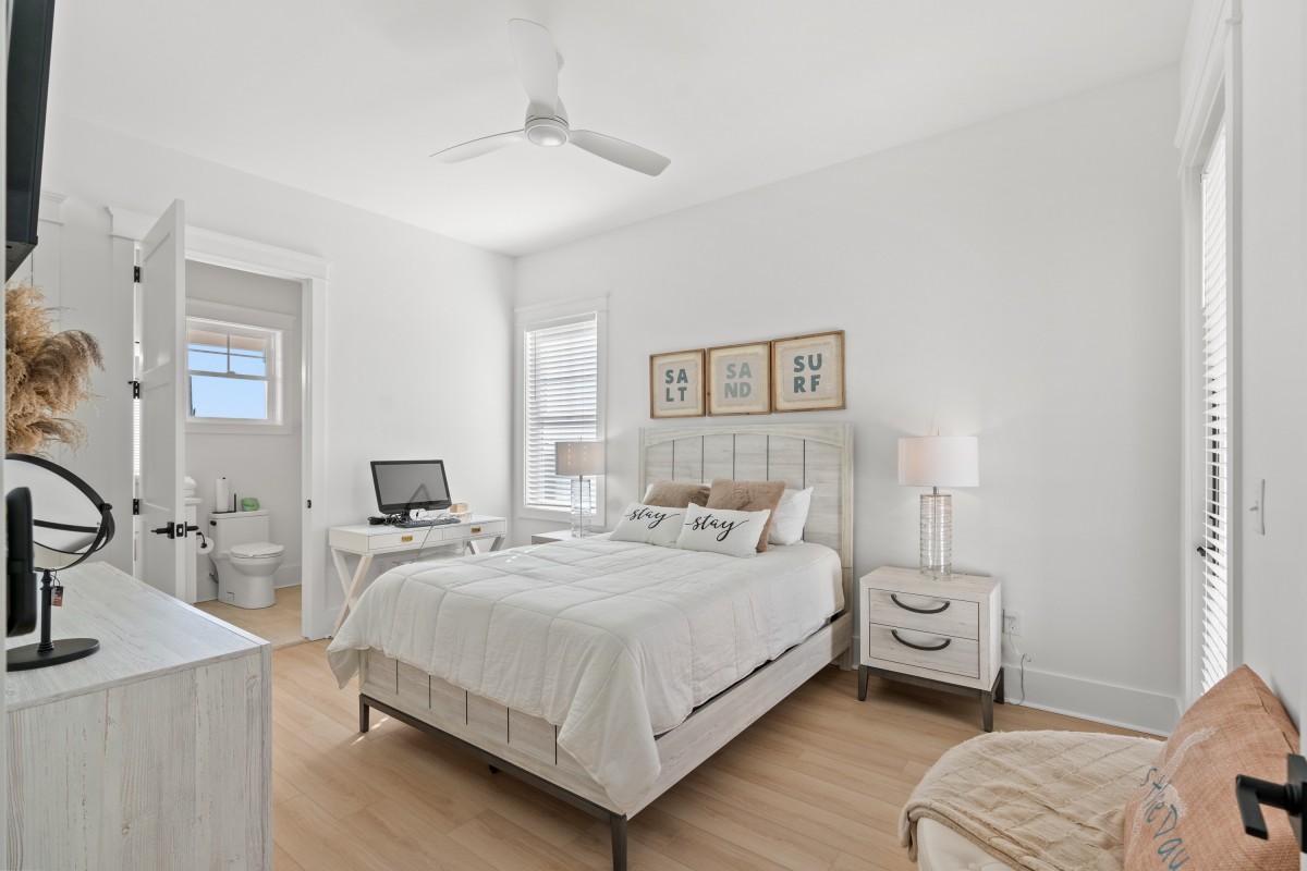 Inside, sunlit open living spaces are decorated in soft, beach-inspired tones that evoke seaside calm. The fully equipped kitchen—with full-size appliances and generous prep space—makes dining at “home” effortless. Each bedroom invites restful sleep, and the modern bathrooms provide convenience and ease.