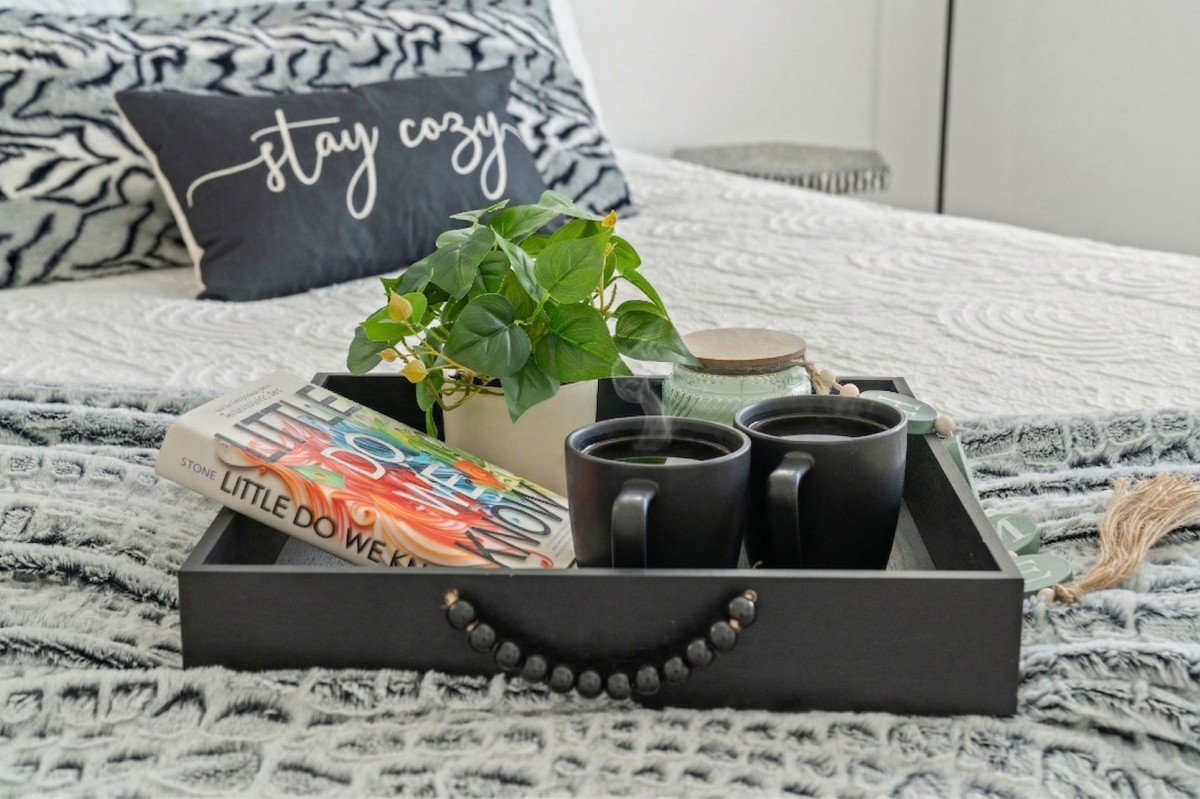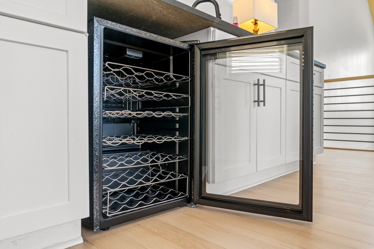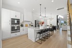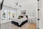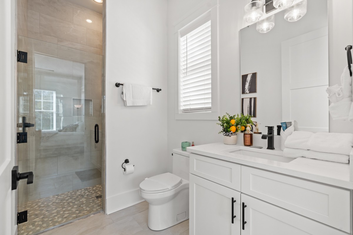 Inside, sunlit open living spaces are decorated in soft, beach-inspired tones that evoke seaside calm. The fully equipped kitchen—with full-size appliances and generous prep space—makes dining at “home” effortless. Each bedroom invites restful sleep, and the modern bathrooms provide convenience and ease.